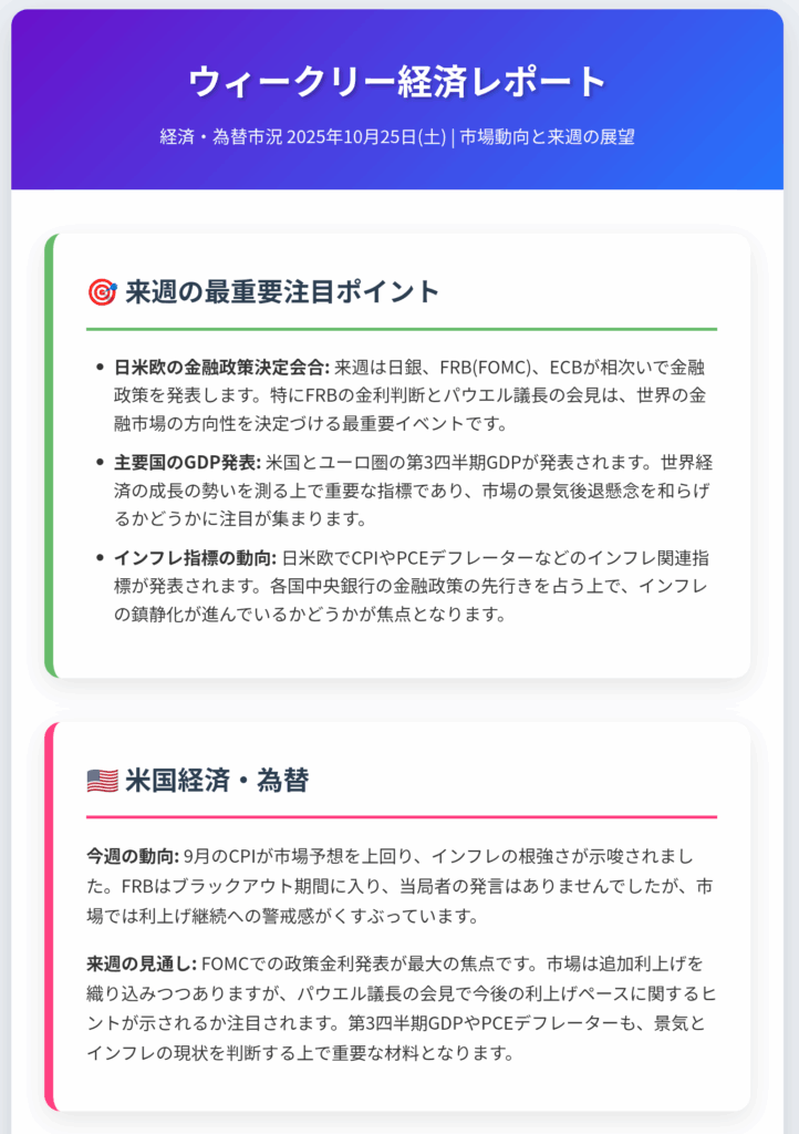 経済・為替市況 2025年10月25日(土) | 市場動向と来週の展望