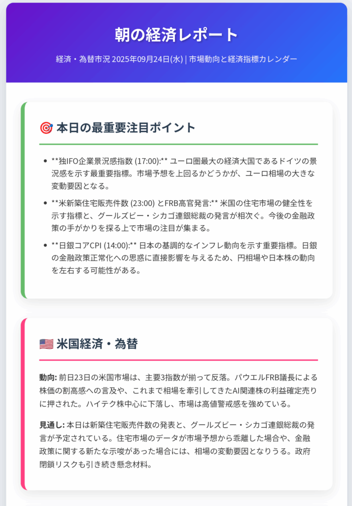 経済・為替市況 2025年09月24日(水) | 市場動向と経済指標カレンダー