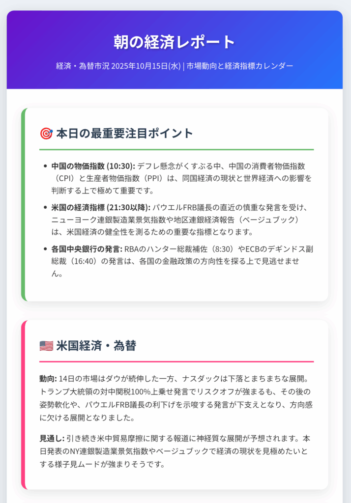 経済・為替市況 2025年10月15日(水) | 市場動向と経済指標カレンダー