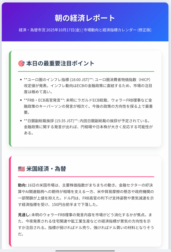 経済・為替市況 2025年10月17日(金) | 市場動向と経済指標カレンダー (修正版)