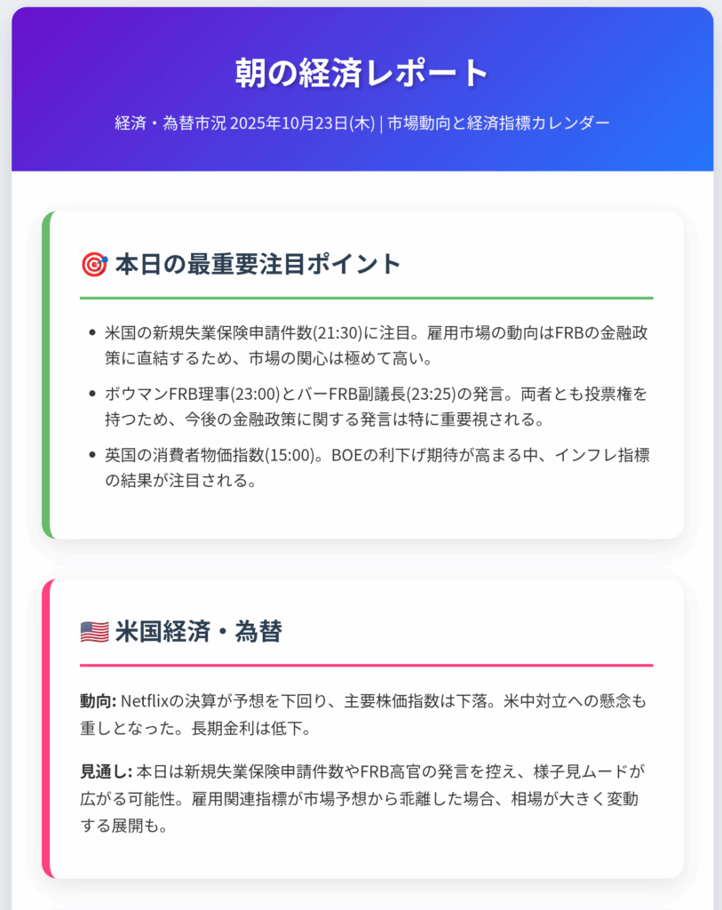 経済・為替市況 2025年10月23日(木) | 市場動向と経済指標カレンダー