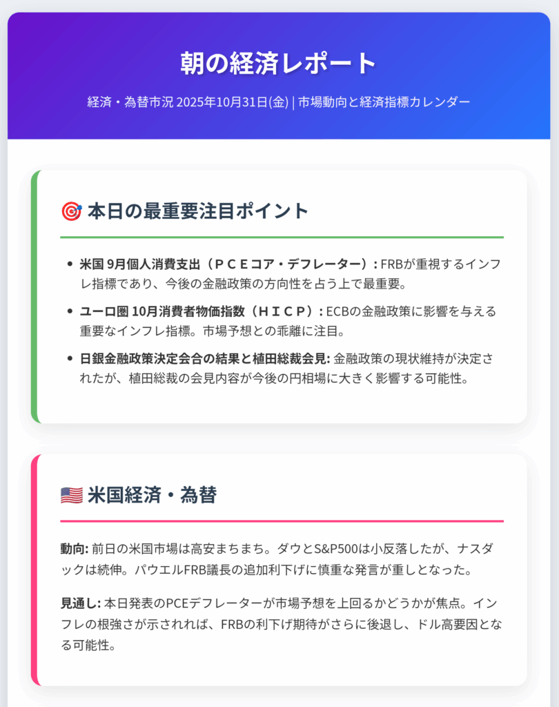 経済・為替市況 2025年10月31日(金) | 市場動向と経済指標カレンダー