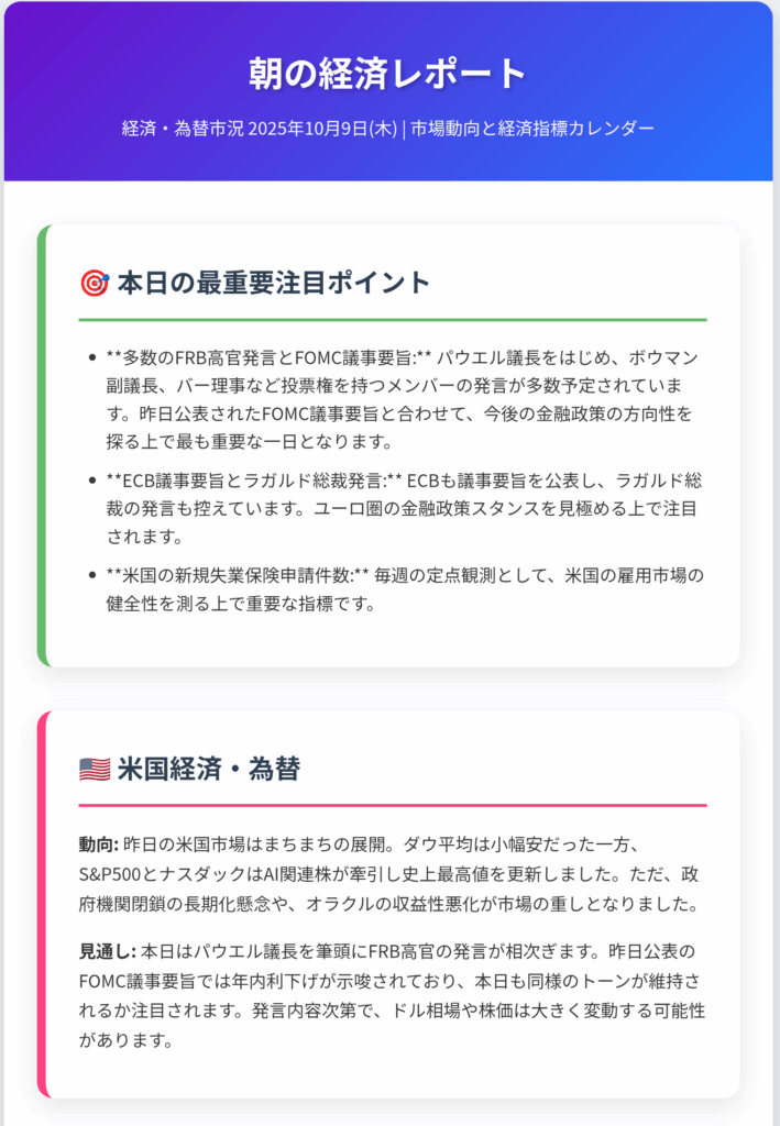 経済・為替市況 2025年10月9日(木) | 市場動向と経済指標カレンダー (修正版)
