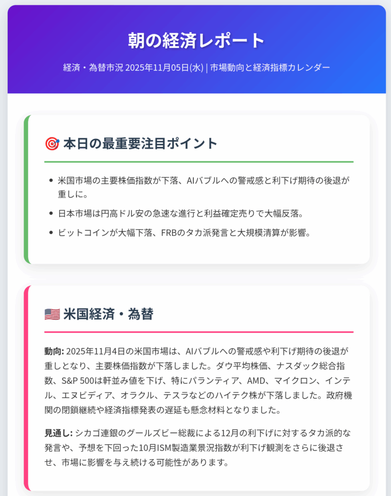 経済・為替市況 2025年11月05日(水) | 市場動向と経済指標カレンダー