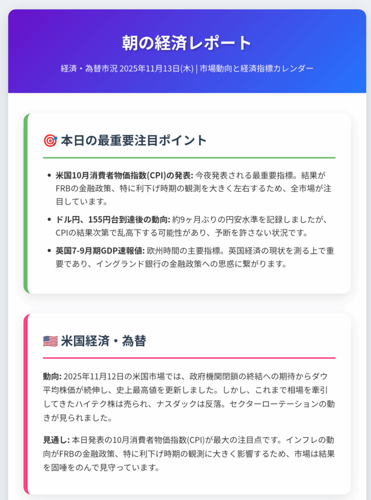 経済・為替市況 2025年11月13日(木) | 市場動向と経済指標カレンダー