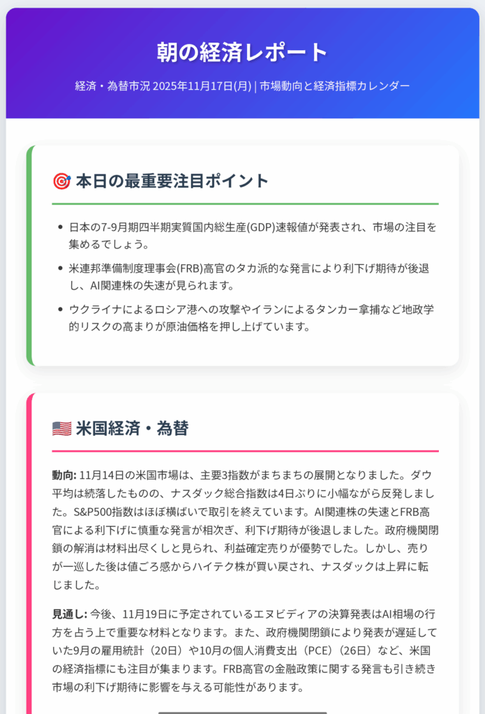 経済・為替市況 2025年11月17日(月) | 市場動向と経済指標カレンダー