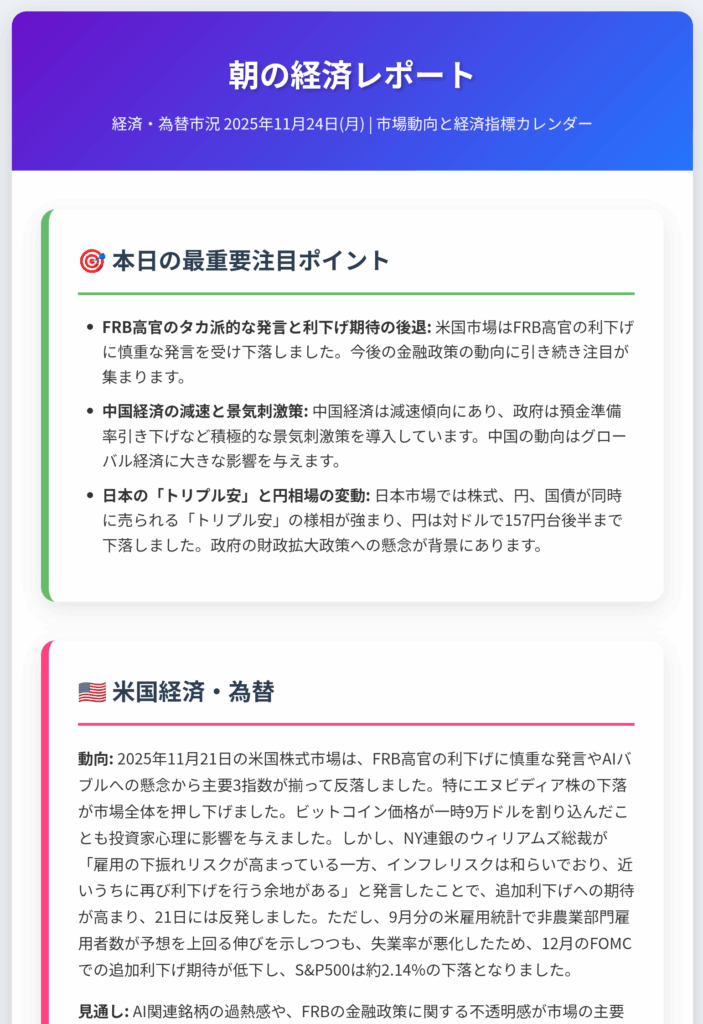 経済・為替市況 2025年11月24日(月) | 市場動向と経済指標カレンダー