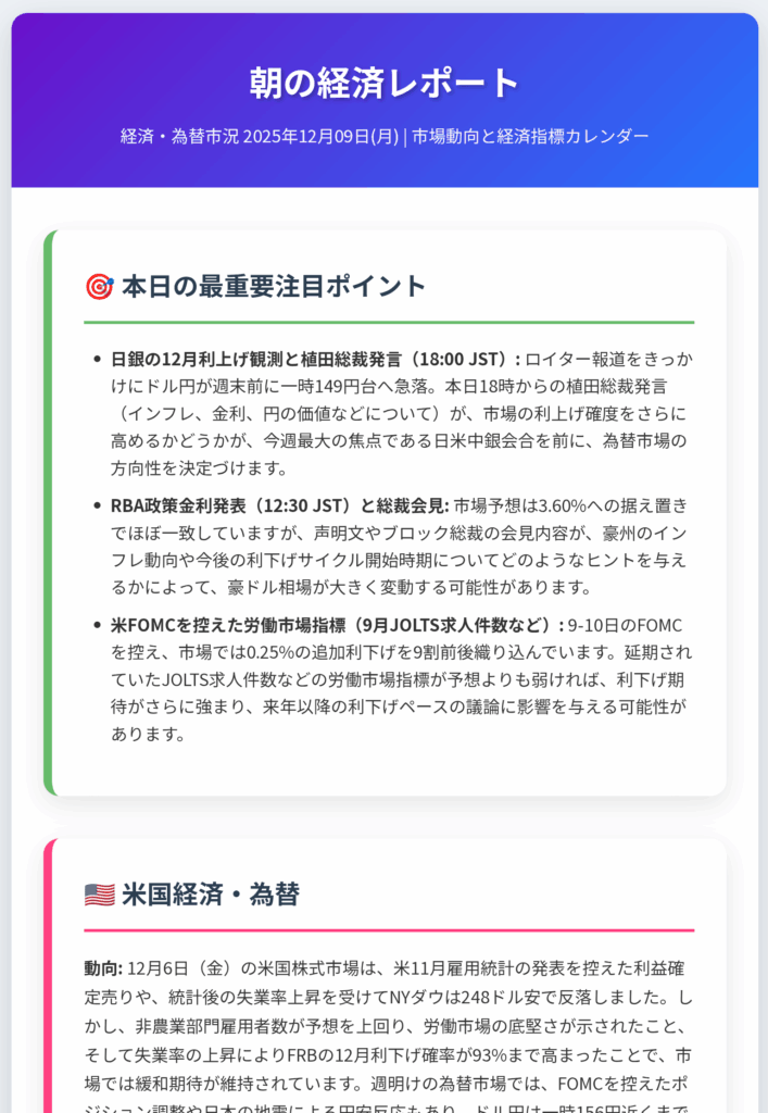 経済・為替市況 2025年12月09日(月) | 市場動向と経済指標カレンダー