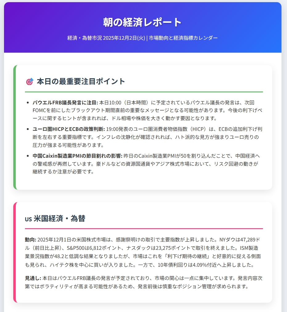 経済・為替市況 2025年12月2日(火) | 市場動向と経済指標カレンダー
