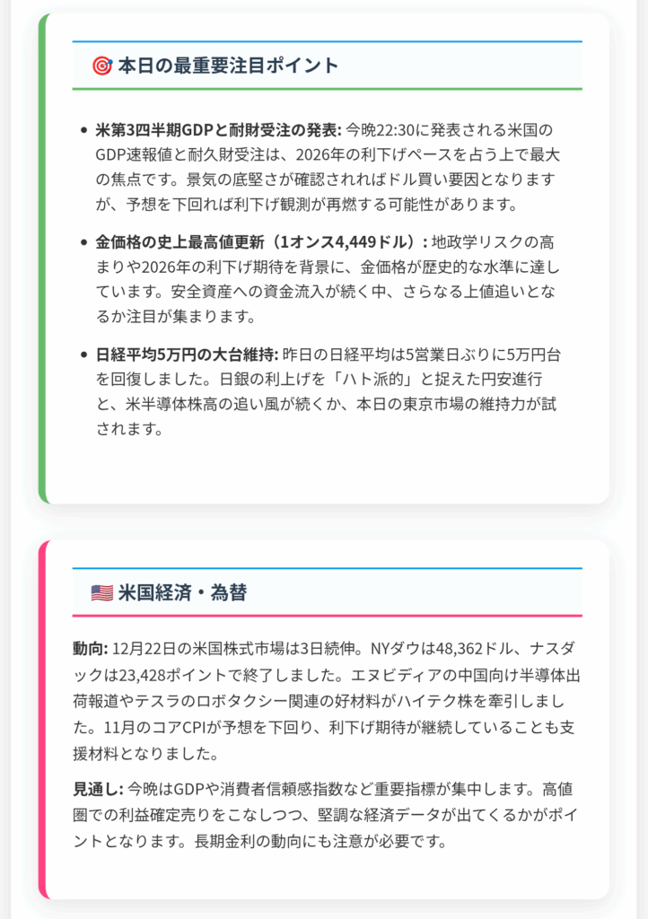 経済・為替市況 2025年12月23日(火) | 日経平均5万円台回復と金価格最高値更新