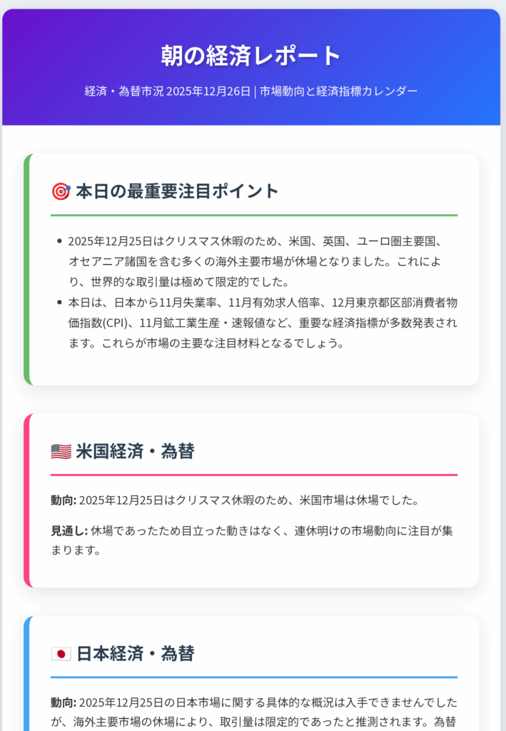 経済・為替市況 2025年12月26日 | 市場動向と経済指標カレンダー