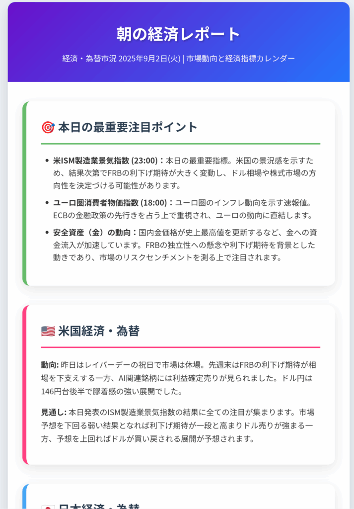 経済・為替市況 2025年9月2日(火) | 市場動向と経済指標カレンダー