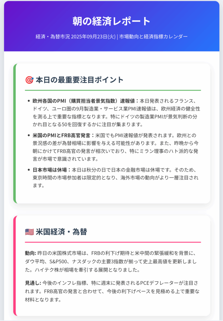 経済・為替市況 2025年09月23日(火) | 市場動向と経済指標カレンダー