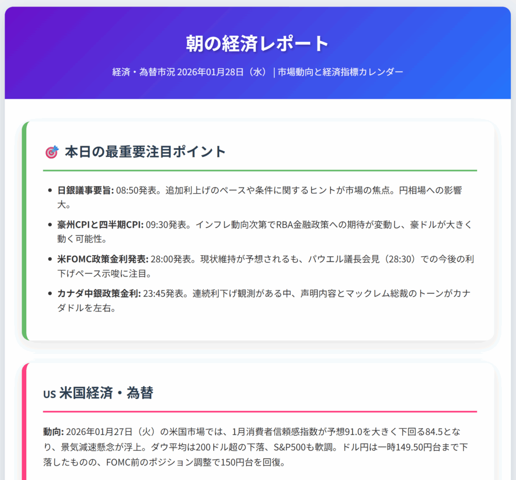 経済・為替市況 2026年01月28日(水) | 市場動向と経済指標カレンダー