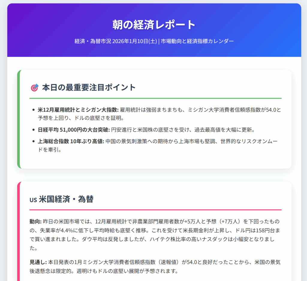 経済・為替市況 2026年1月10日(土) | 市場動向と経済指標カレンダー