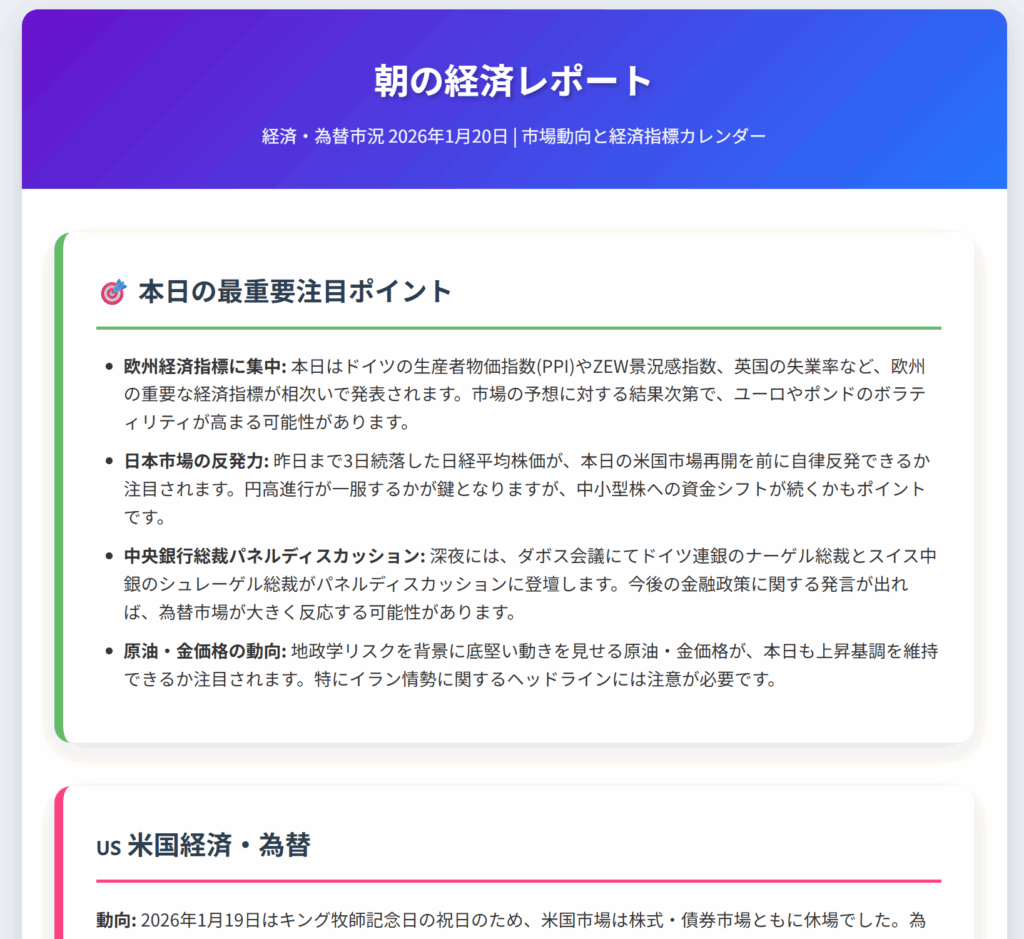 経済・為替市況 2026年1月20日 | 市場動向と経済指標カレンダー