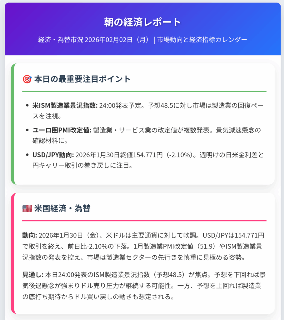 経済・為替市況 2026年02月02日(月) | 市場動向と経済指標カレンダー