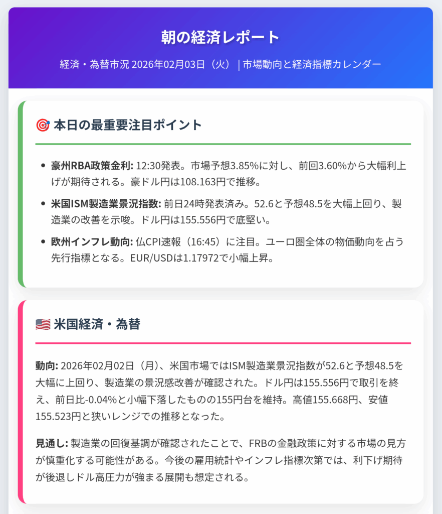経済・為替市況 2026年02月03日(火) | 市場動向と経済指標カレンダー