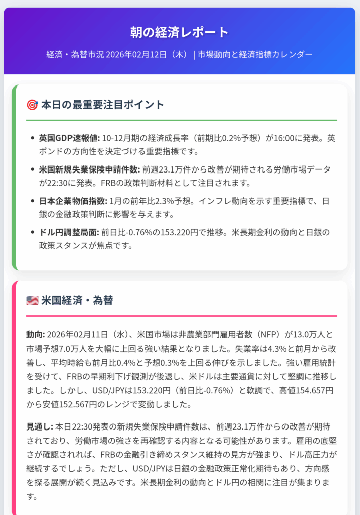 経済・為替市況 2026年02月12日(木) | 市場動向と経済指標カレンダー