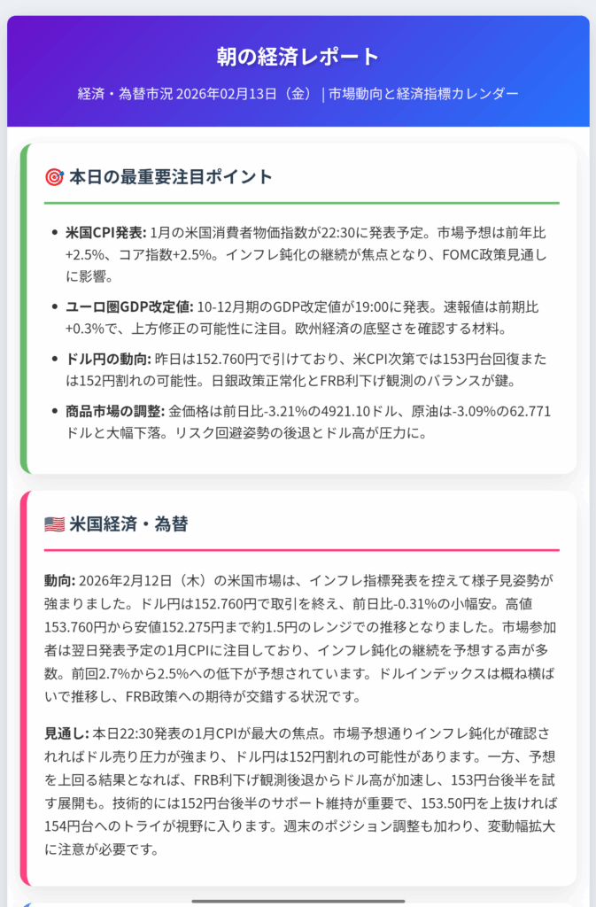 経済・為替市況 2026年02月13日(金) | 市場動向と経済指標カレンダー