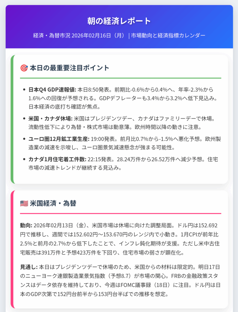 経済・為替市況 2026年02月16日(月) | 市場動向と経済指標カレンダー