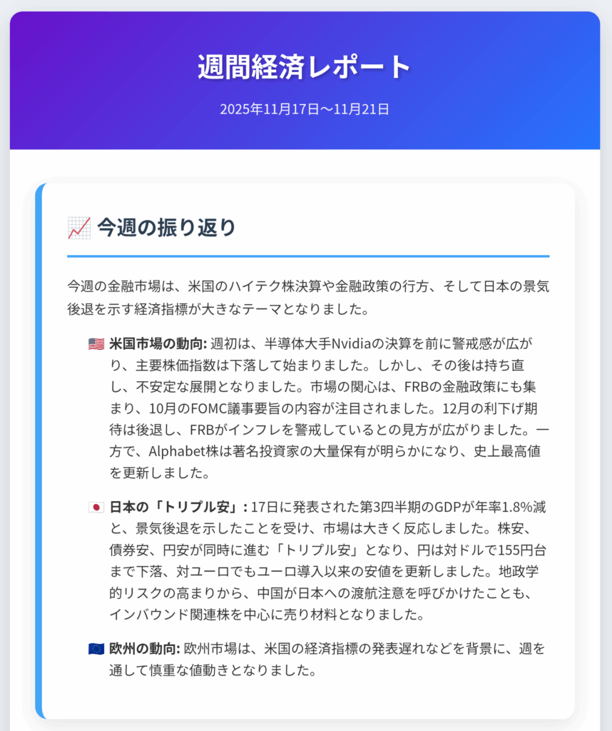 - 🇺🇸米国市場の動向: 週初は、半導体大手Nvidiaの決算を前に警戒感が広がり、主要株価指数は下落して始まりました。しかし、その後は持ち直し、不安定な展開となりました。市場の関心は、FRBの金融政策にも集まり、10月のFOMC議事要旨の内容が注目されました。12月の利下げ期待は後退し、FRBがインフレを警戒しているとの見方が広がりました。一方で、Alphabet株は著名投資家の大量保有が明らかになり、史上最高値を更新しました。